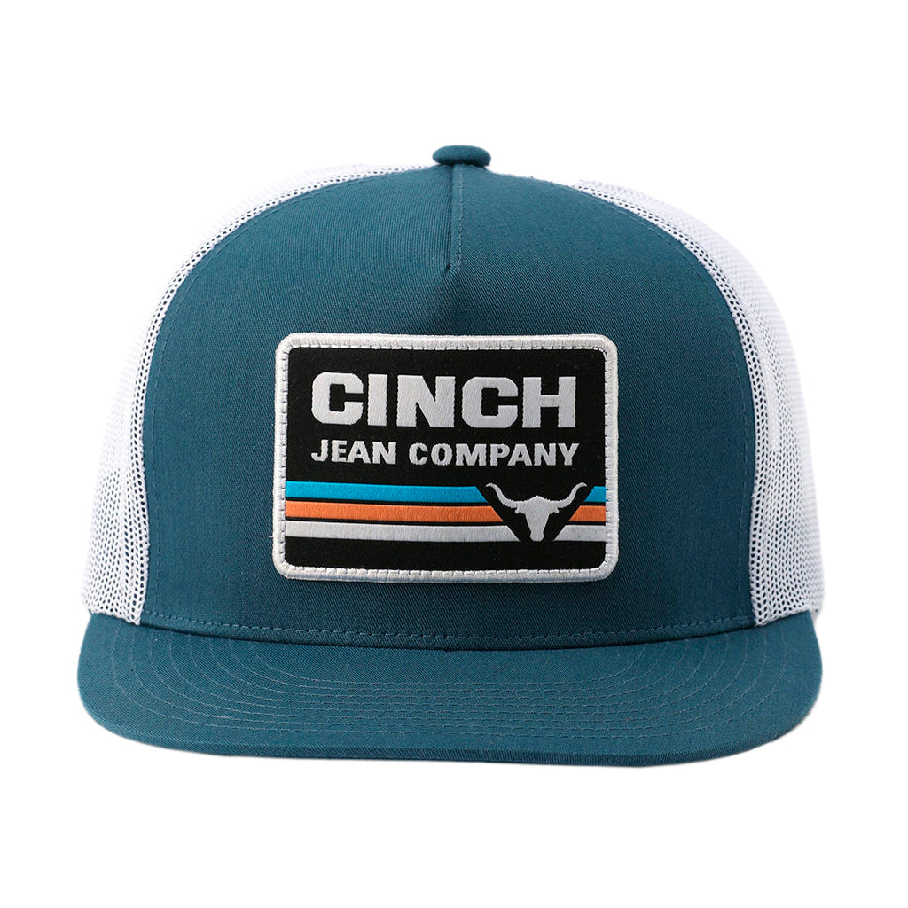 Esta gorra de camionero verde azulado de CINCH es la gorra de diario que complementa cualquier atuendo ranchero. Con un diseño de perfil alto y una construcción de 5 paneles, esta gorra incluye un parche tejido con el logotipo de CINCH Jean Company y un cierre trasero seguro con broches