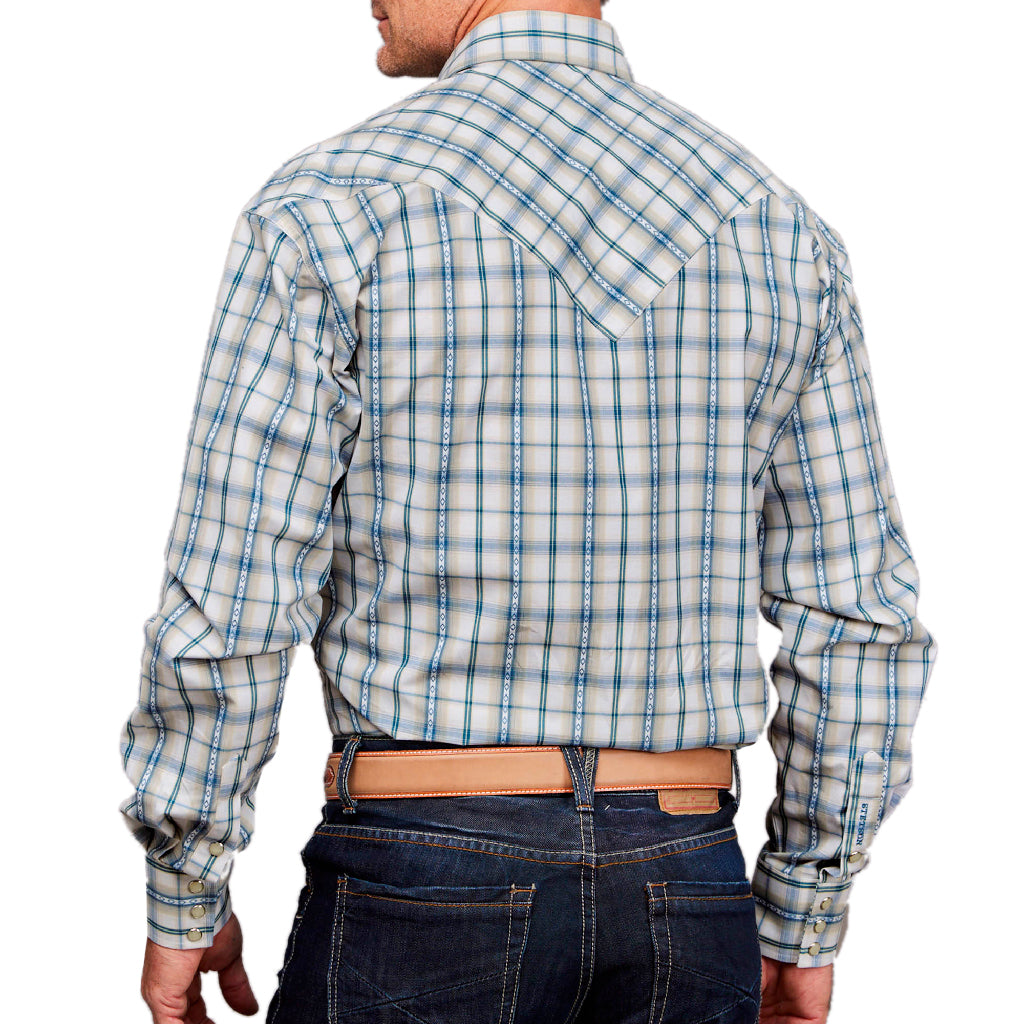 • Camisa Stetson color beige y estampado de cuadros con franjas en varios tipos de azul