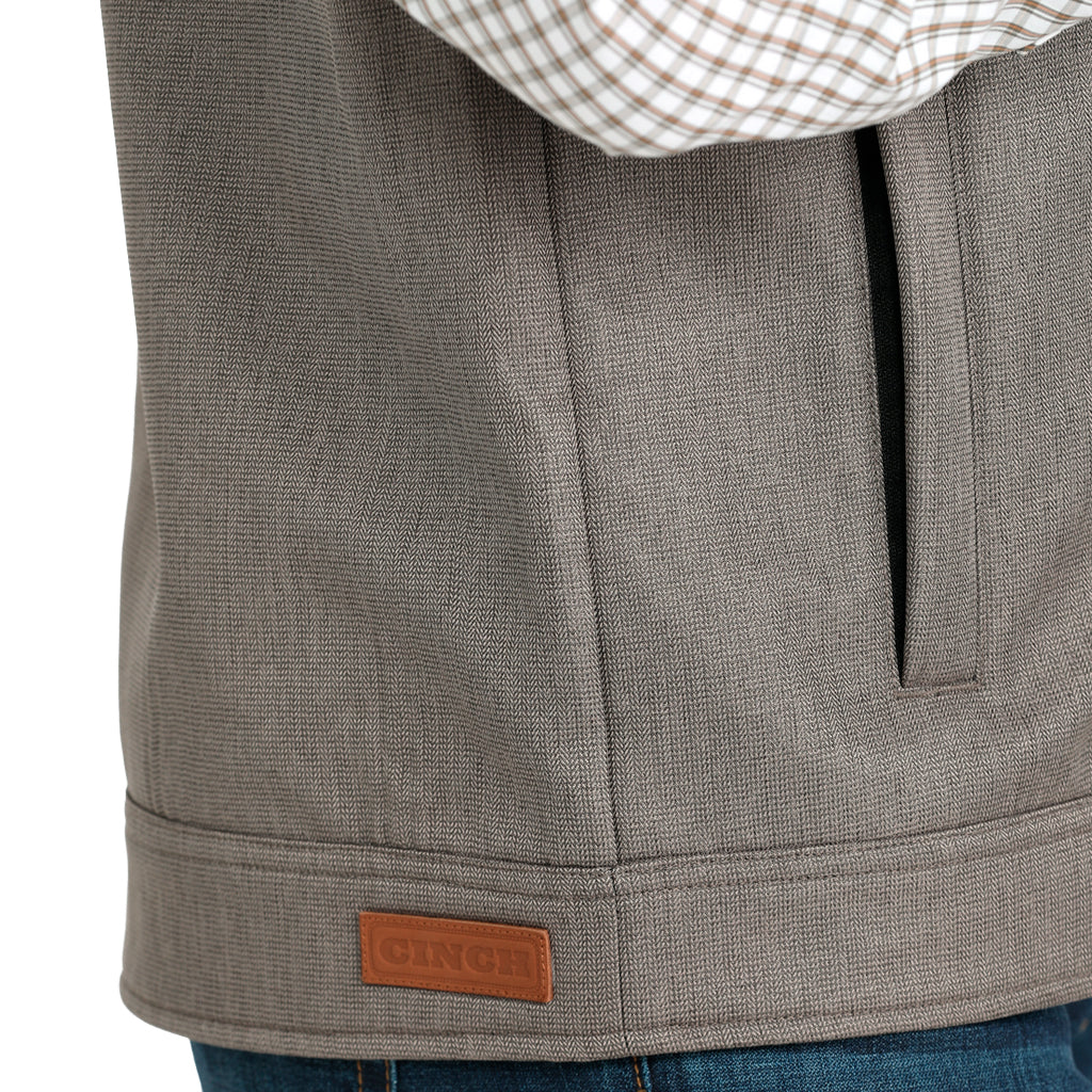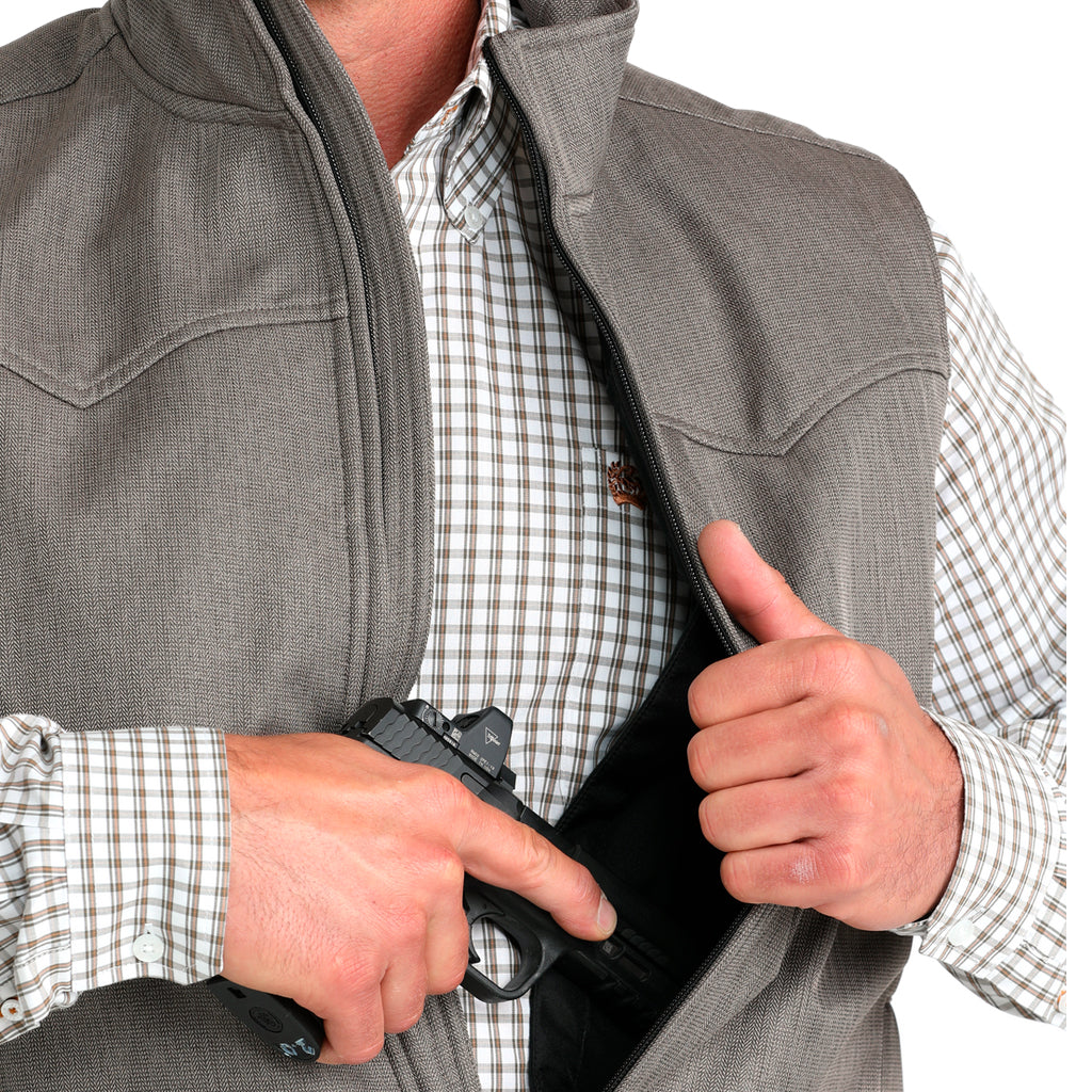 Para climas fríos y necesidades de protección personal, se recomienda un chaleco de porte oculto de alto rendimiento como este modelo marrón de poliéster con patrón de espiga de CINCH. Esta prenda para tres estaciones permite ocultar el arma en uno de sus dos bolsillos interiores o con la funda con cierre de velcro. Entre sus características destacan los canesús estilo western, prácticos bolsillos exteriores y un acabado repelente al agua duradero (DWR).
