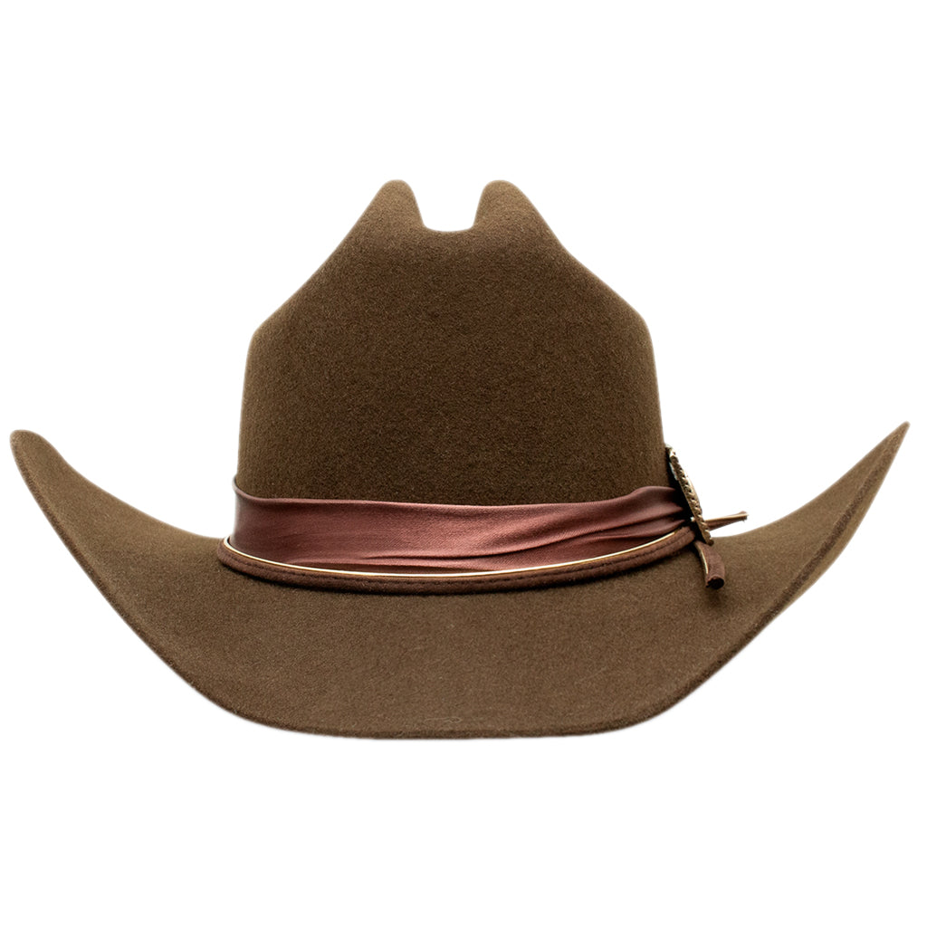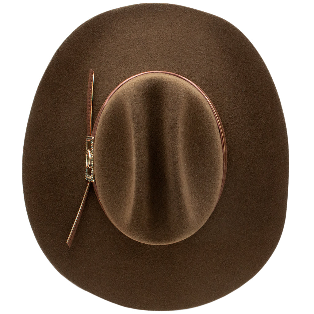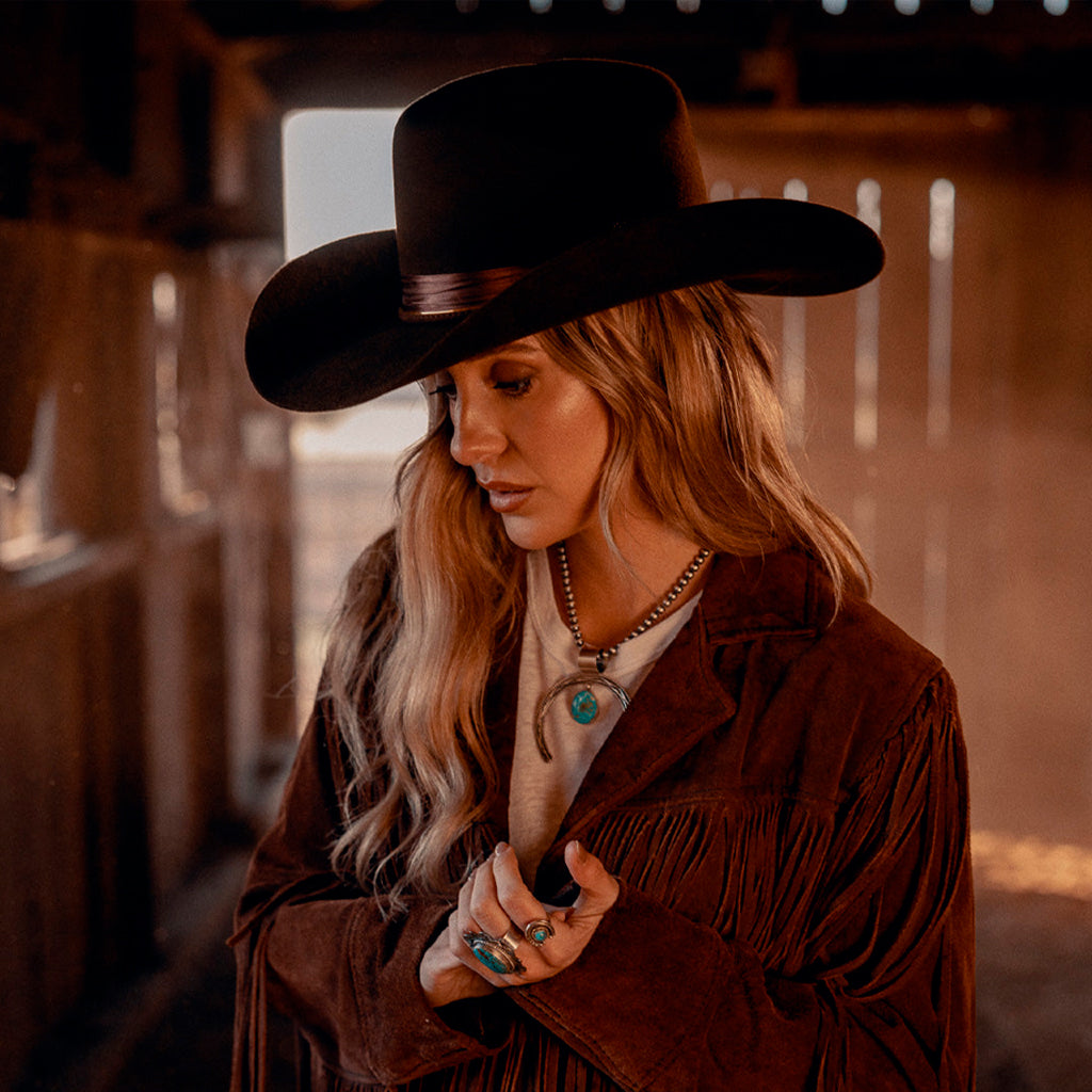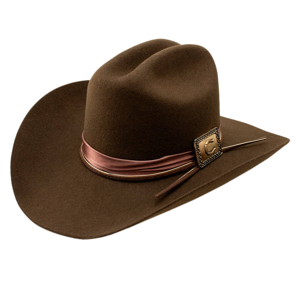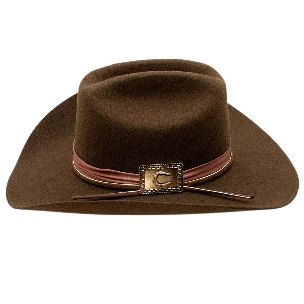 Saca a relucir tu lado más cantor con este sombrero exclusivo de Lainey Wilson. Este sombrero rinde homenaje al estilo campestre atemporal y la elegancia clásica. Confeccionado en un intenso color chocolate, el Songbird cuenta con una ala de 10 cm que le da un aspecto audaz y clásico. La sofisticada cinta está acentuada por un concho cuadrado color bronce, adornado artísticamente con la clásica herradura de Charlie. Es la combinación perfecta de encanto rústico y detalles refinados, ideal para quienes cantan a su manera.