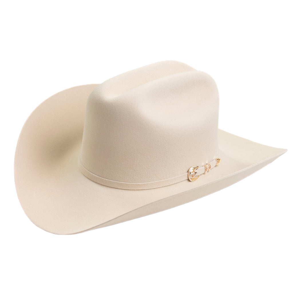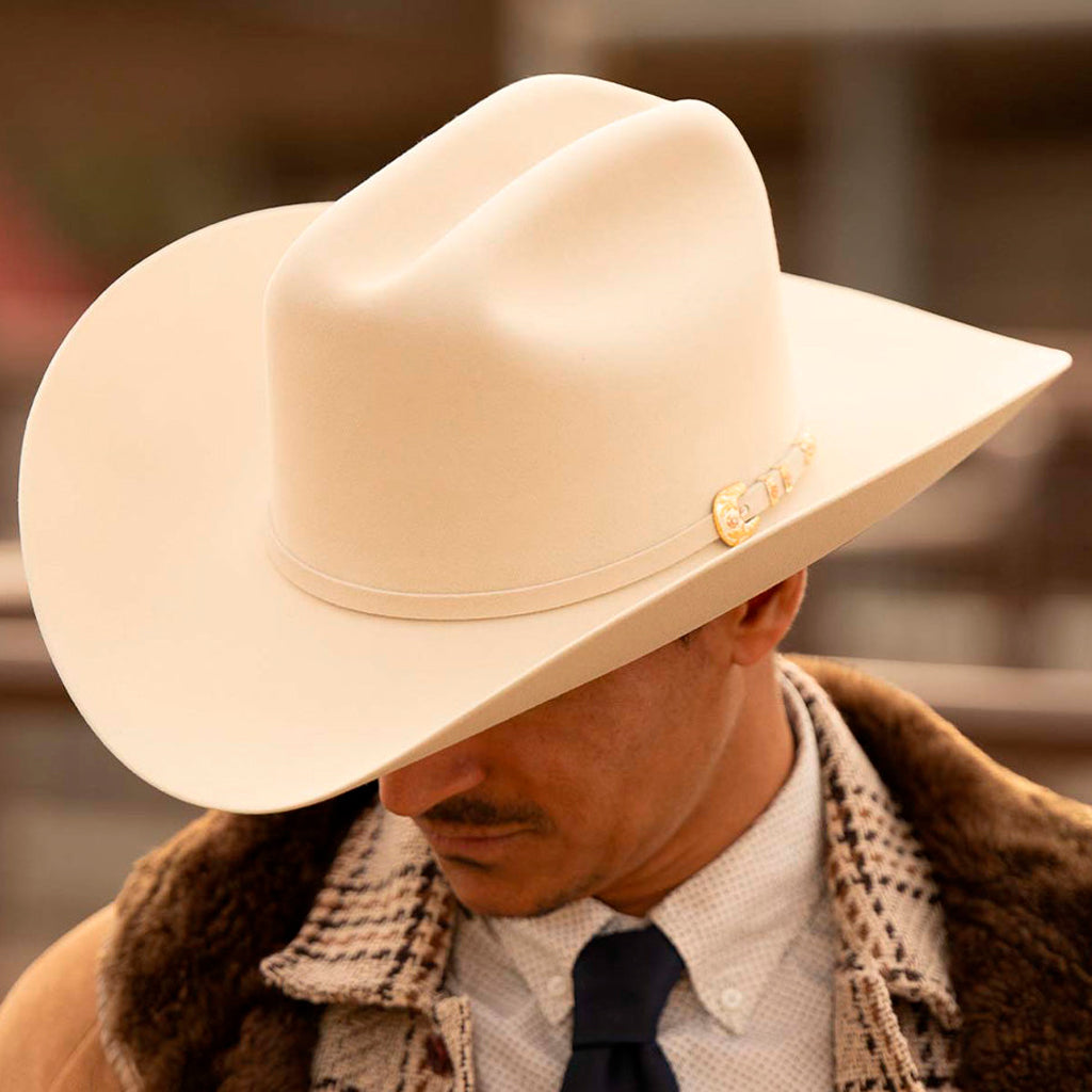 El 500X Superior es la joya de la corona de los sombreros vaqueros. Fabricado con pelo de castor de primera calidad, con horma ganadera y una refinada ala de 10 cm, es la máxima expresión del prestigio del Oeste.