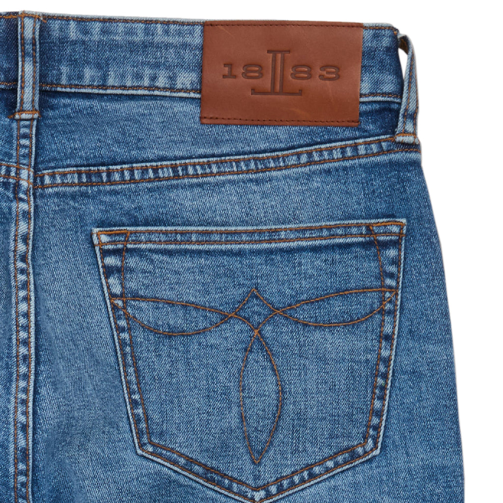 • Medallón cosido en la puntera de los bolsillos traseros