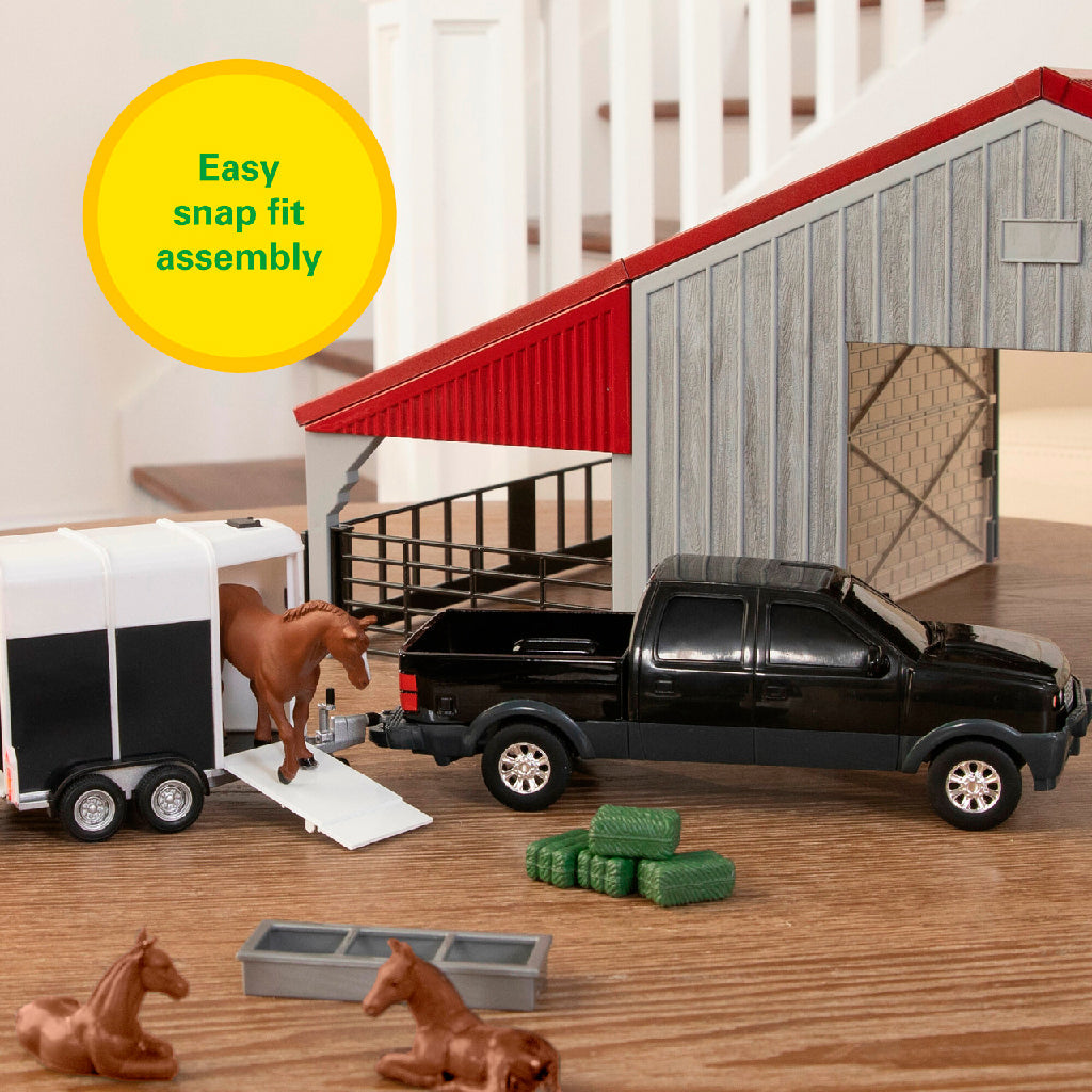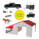 • Juego de juguetes de granja: 13 piezas que incluye granero, caimán John Deere RSX 860i, camioneta, remolque para caballos, 4 caballos de juguete, comedero y 4 pacas cuadradas
