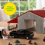 ¿Listo para jugar con caballos? Este set de granja de 13 piezas tiene todo lo necesario para divertirse a lo grande. El granero cuenta con un exterior único con aspecto desgastado y es el lugar perfecto para guardar los vehículos y los caballos en el corral dentro de la sección cercada. El John Deere RSX 860i Caimán cuenta con una caja basculante que facilita la descarga de las pacas de heno incluidas para alimentar a los caballos y potros. El granero se ensambla fácilmente a presión, lo que permite recogerlo y reubicarlo fácilmente sin que se desarme. Este set de granja de juguete es una excelente manera de inspirar el juego imaginativo para los pequeños aficionados a la granja