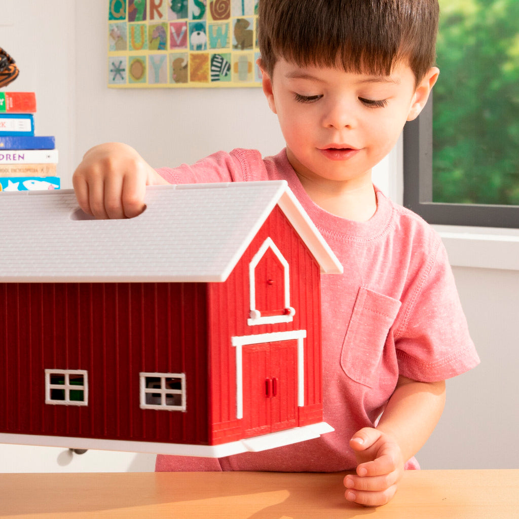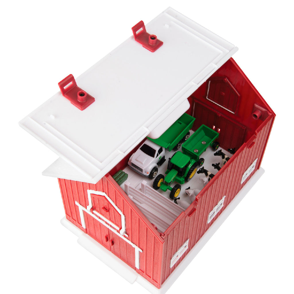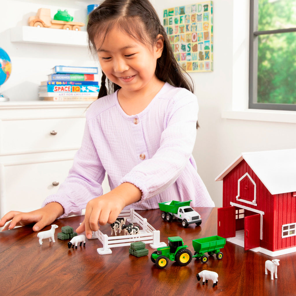 Este set de juego de la granja John Deere es perfecto para disfrutar de la granja en cualquier lugar. Las piezas a escala 1:64 tienen el tamaño perfecto para llevarlo a cualquier parte e incluyen todo lo necesario para que los niños se diviertan creativamente en la granja. Incluye un camión y un tractor con vagón. Llénalos con fardos de heno para alimentar a los animales de la granja. Los animales incluyen cuatro vacas y cuatro ovejas que los niños pueden mantener a salvo usando las piezas de cerca incluidas. El granero rojo aporta más diversión imaginativa al juego y también funciona como contenedor de almacenamiento: simplemente levanta el techo para colocar objetos dentro. El asa integrada te permite llevar la granja fácilmente de paseo.