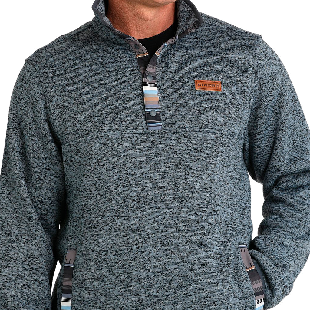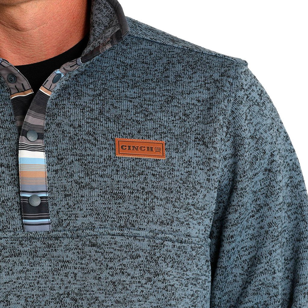 Este jersey de punto de poliéster azul es un estilo informal de vaquero con el estilo suficiente para pasar del trabajo en el rancho a una cena en la ciudad. Las características del diseño incluyen ribetes estampados en contraste con cuello alto, tapeta con botones a presión y un parche de cuero con el logotipo de CINCH.