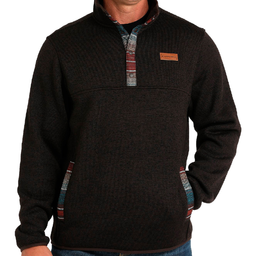 Este jersey de punto de poliéster marrón es un estilo informal de vaquero con el estilo suficiente para pasar del trabajo en el rancho a una cena en la ciudad. Las características del diseño incluyen ribetes estampados en contraste con cuello alto, tapeta con botones a presión y un parche de cuero con el logotipo de CINCH.