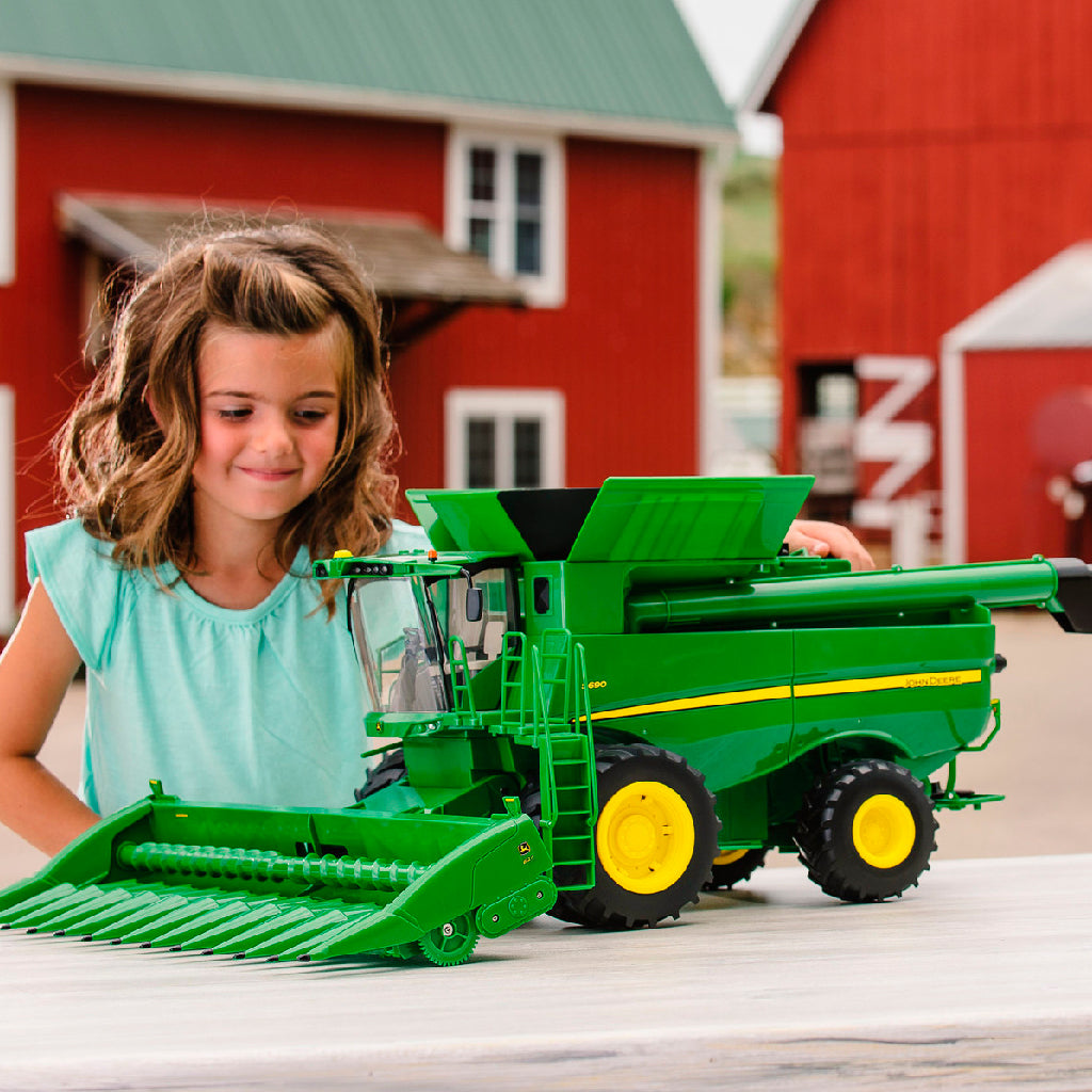 La cosechadora John Deere S690 Big Farm a escala 1:16 permite que tu pequeño granjero se divierta al máximo mientras trabaja. Ideal para jugar en interiores y exteriores, esta cosechadora cuenta con ruedas delanteras desmontables y la capacidad de descargar granos de palomitas de maíz (no incluidos) del tanque de grano a través del sinfín. Las luces y los sonidos añaden un toque realista a la acción del juego. Incluye un cabezal para maíz, un cabezal de corte y un enganche trasero compatible con la mayoría de los aperos de granja a escala 1:16.